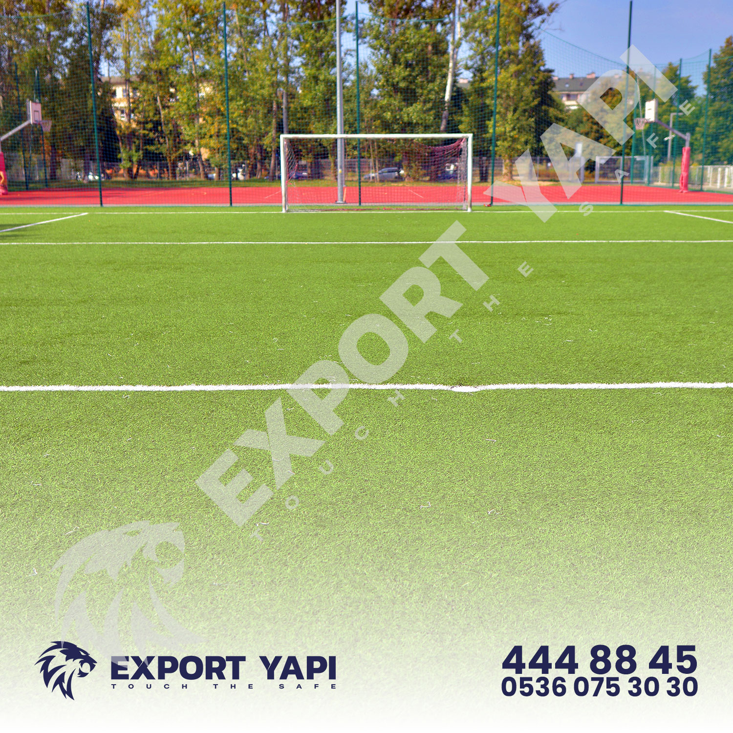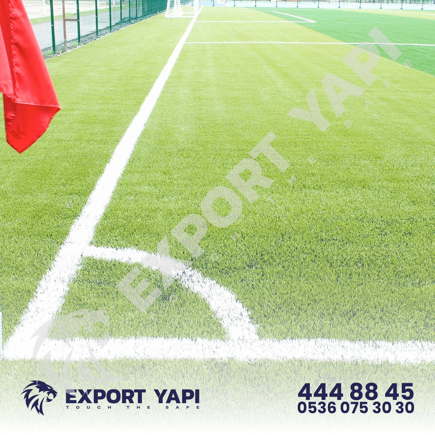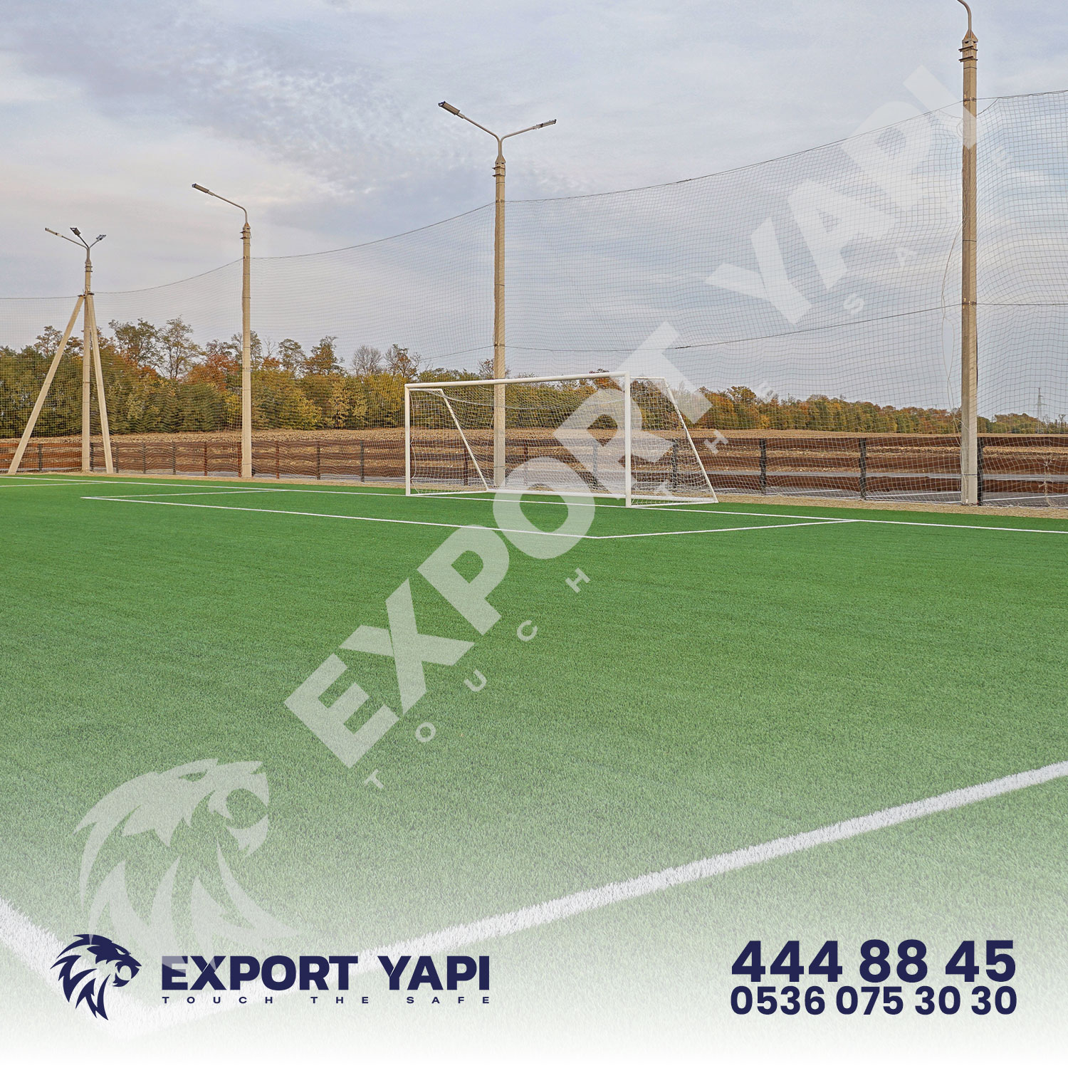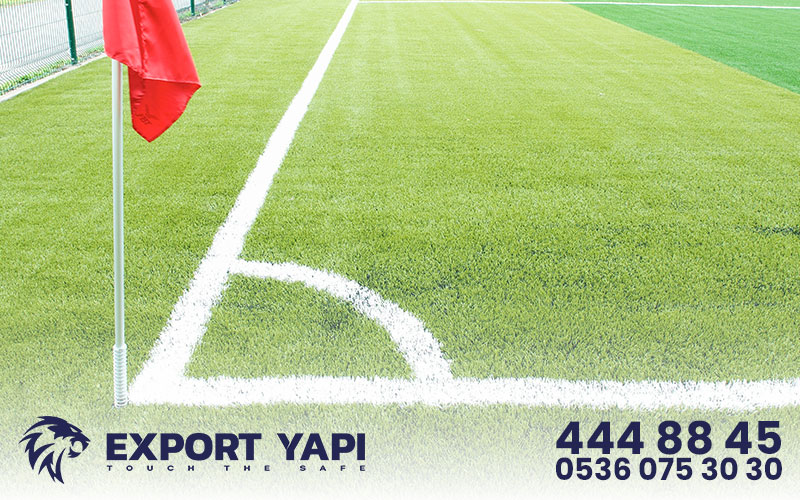 Saha çevresi, galvanizli tel çit veya çim çit sistemleriyle çevrilir; bu da hem güvenlik hem estetik sağlar.